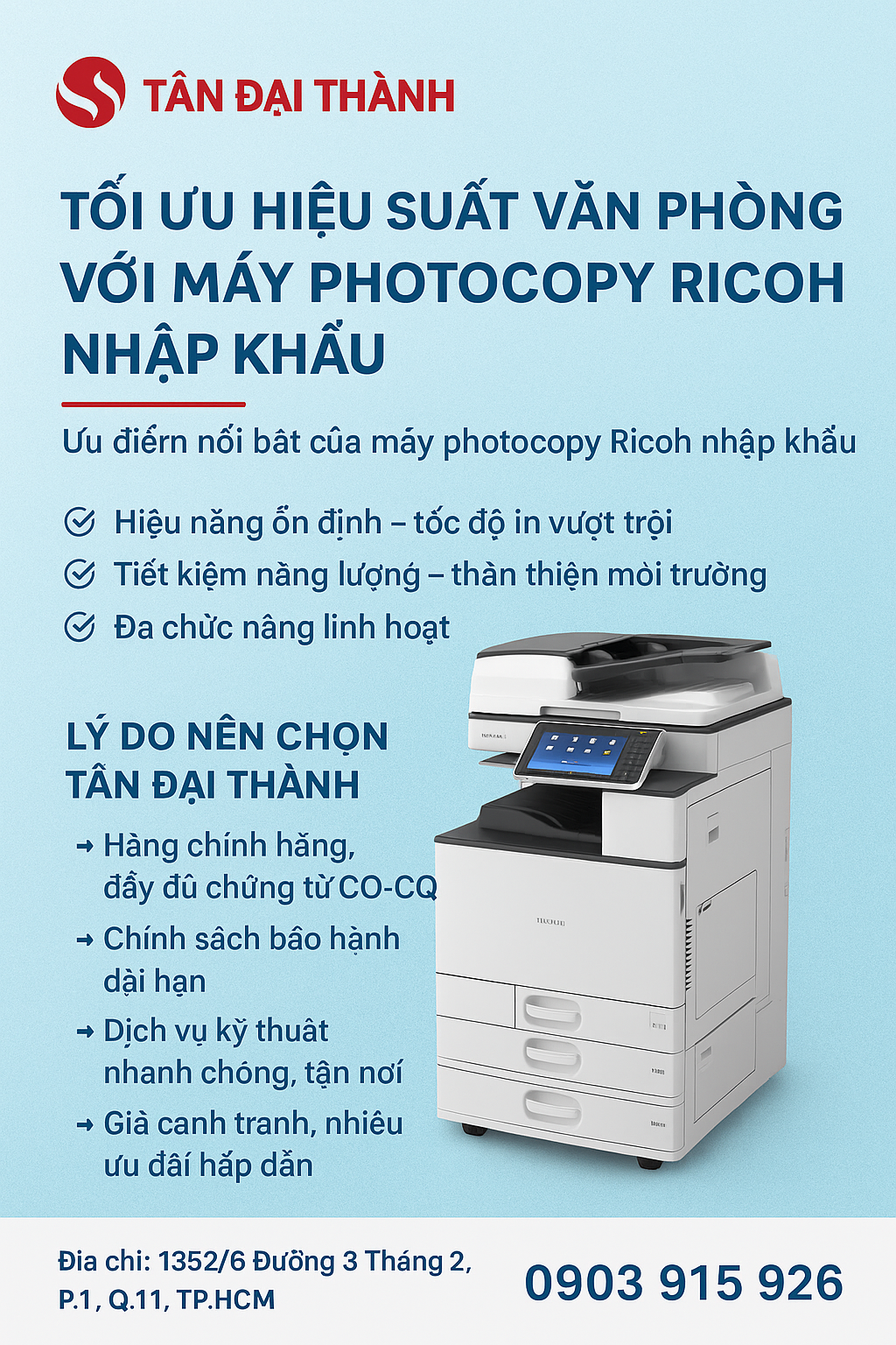 Trong thời đại công nghệ phát triển mạnh mẽ, việc lựa chọn thiết bị văn phòng phù hợp đóng vai trò then chốt trong việc nâng cao năng suất làm việc. Trong đó, máy photocopy Ricoh nhập khẩu đang trở thành lựa chọn hàng đầu của nhiều doanh nghiệp tại TP.HCM nhờ vào chất lượng vượt trội và độ bền đáng tin cậy.