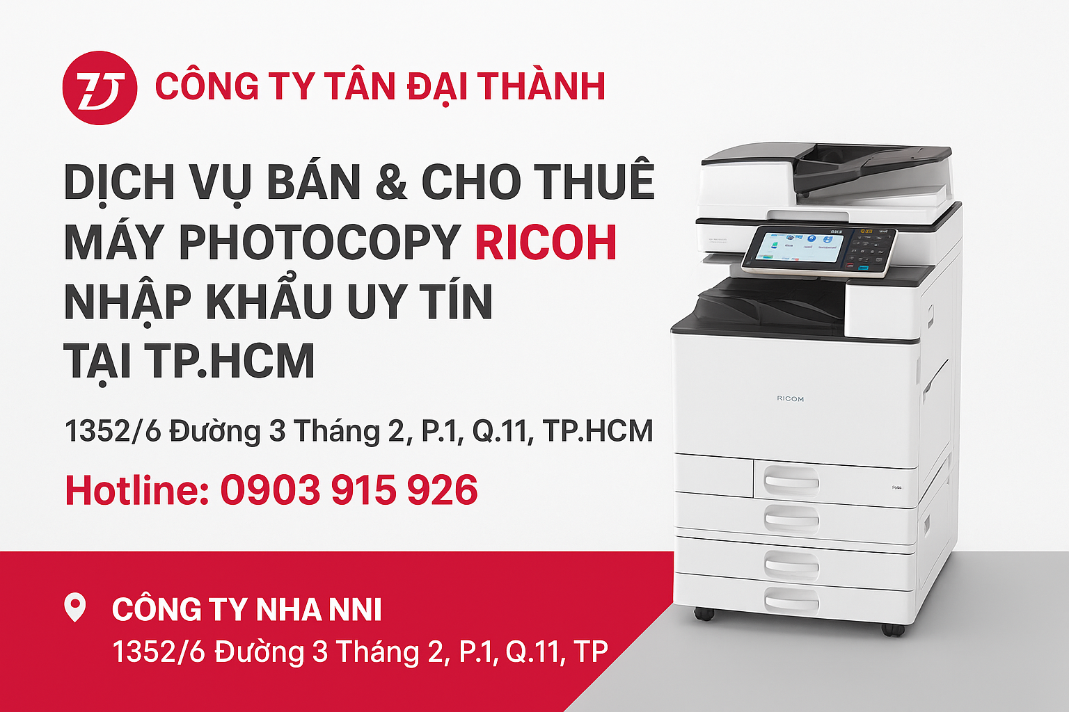 Trong thời đại công nghệ phát triển mạnh mẽ, máy photocopy không chỉ là thiết bị văn phòng đơn thuần mà còn là “trợ thủ đắc lực” giúp doanh nghiệp vận hành hiệu quả hơn mỗi ngày. Nếu bạn đang tìm kiếm máy photocopy Ricoh nhập khẩu chính hãng – bền bỉ, tiết kiệm và chất lượng vượt trội, thì Tân Đại Thành chính là địa chỉ đáng tin cậy hàng đầu tại TP.HCM.