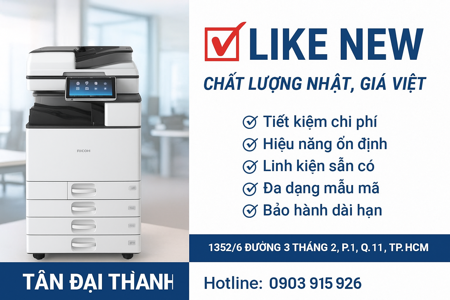 Tân Đại Thành chuyên nhập khẩu trực tiếp máy photocopy Ricoh like new nguyên bản, được kỹ thuật viên kiểm tra – bảo dưỡng toàn diện trước khi đến tay khách hàng.