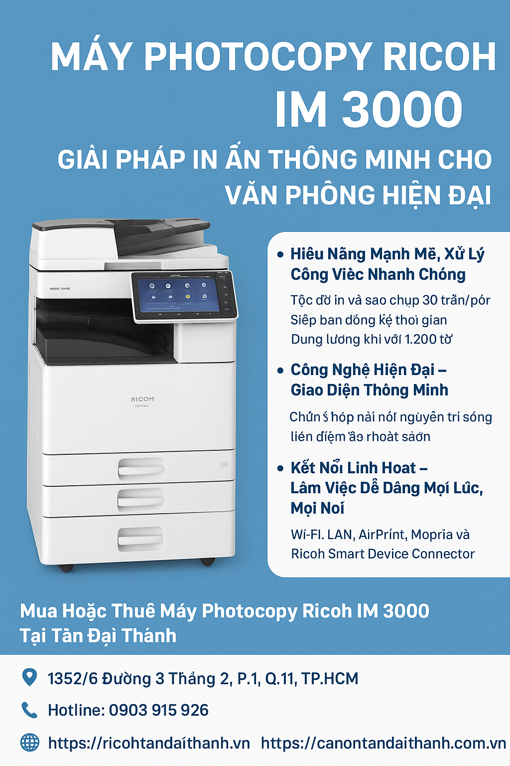 Trong môi trường làm việc hiện đại, việc sở hữu một thiết bị in ấn mạnh mẽ, linh hoạt và tiết kiệm là nhu cầu tất yếu của mọi doanh nghiệp. Máy photocopy Ricoh IM 3000 ra đời như một giải pháp toàn diện, mang đến hiệu suất vượt trội và khả năng kết nối thông minh – giúp tối ưu hóa quy trình vận hành văn phòng chuyên nghiệp.