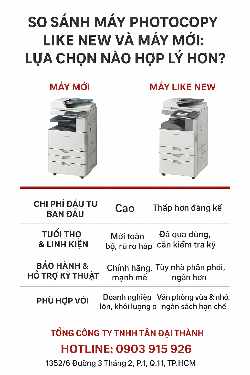 Công ty TNHH Tân Đại Thành — nhà phân phối uy tín tại TP.HCM chuyên máy photocopy like new nhập khẩu và máy mới chính hãng. Cam kết sản phẩm rõ nguồn gốc, bảo hành tận nơi, giá hợp lý.