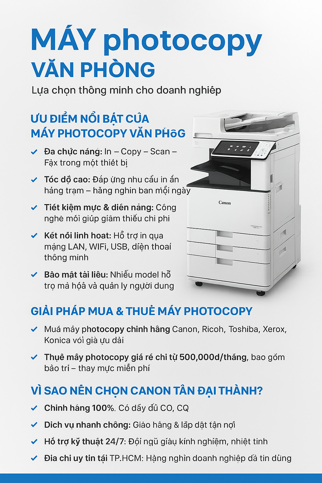 Trong thời đại số hóa, máy photocopy không chỉ đơn thuần là thiết bị sao chép tài liệu, mà còn là giải pháp toàn diện giúp văn phòng vận hành hiệu quả, tiết kiệm thời gian và chi phí.